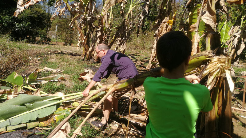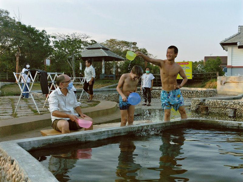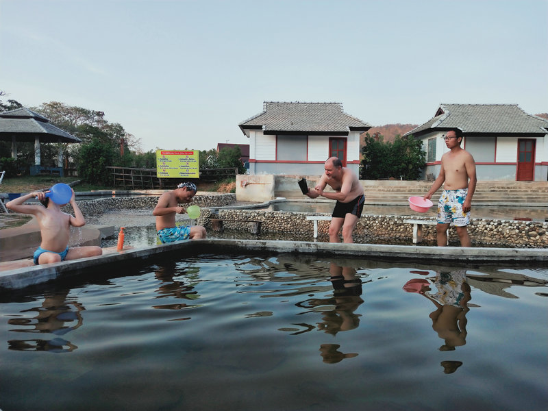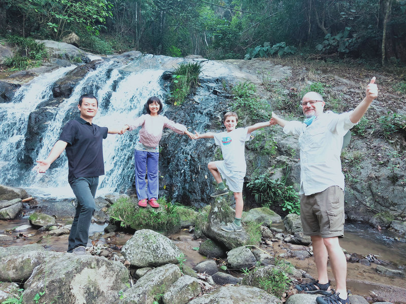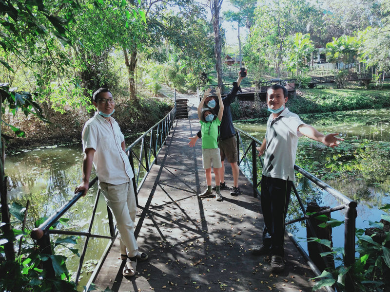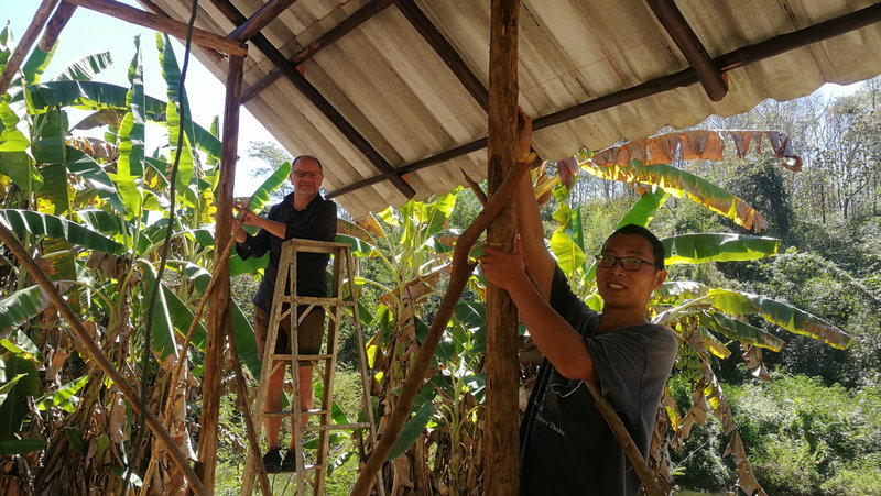 輝一應他們提出意願,就是出來旅行放鬆的,這三天我們陪他們參觀了一處寺院,第二天去遊覽了一番家園附近的國王公園,第三天也是去到附近約開車半小時的Tad mork waterful,這是一處環境清雅幽靜的叢林瀑布,進入其中感覺清涼壯觀,開滿了曼陀羅花的原始森林,給人一種美麗純樸的自然視角,每個人都感到滿滿的喜悅開心能量, 接著帶他們體驗了村子裡的特色溫泉洗浴,來過這裏的志願者都很喜歡,因為此處溫泉水泰國民眾共同維護的很好,幾乎沒有污染,有好幾個溫泉池,每個池水水溫略有不同,選擇一處水溫適宜的池子,就可以盡情享受了,每每沐浴完畢肌膚清爽柔潤,更加光滑細膩,很是不錯的一種免費體驗。 他們自然也愉快的完成了此項活動。 同時他們也饒有興趣的幫助我們建設新房屋,砍伐多餘的香蕉樹,增加了旅行見聞和樂趣,輝一和慧光用他們流利的英語介紹了曾經家園運行的生活模式狀態和來到泰國建設分院的緣由,並通過百川製作的英文視頻也讓他們有了一些直觀美好的畫面瞭解。 希望他們在這裡感受到溫馨愜意有收穫,不虛此行吧。