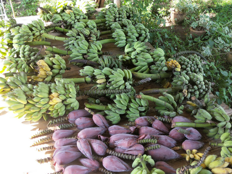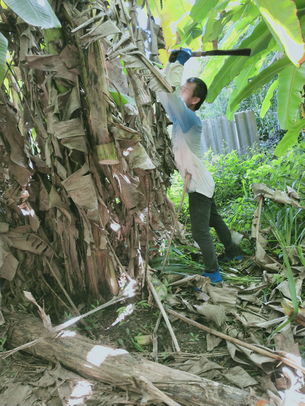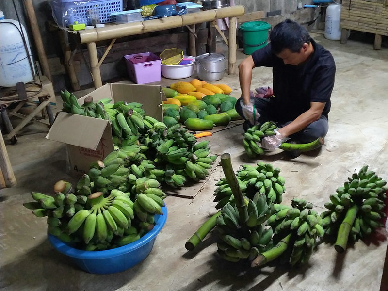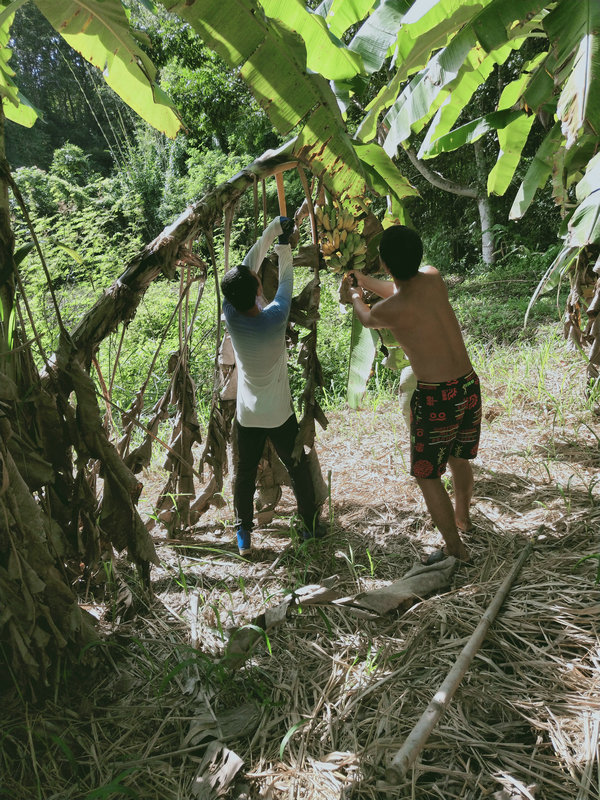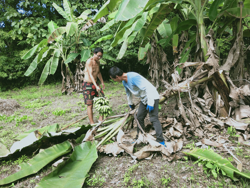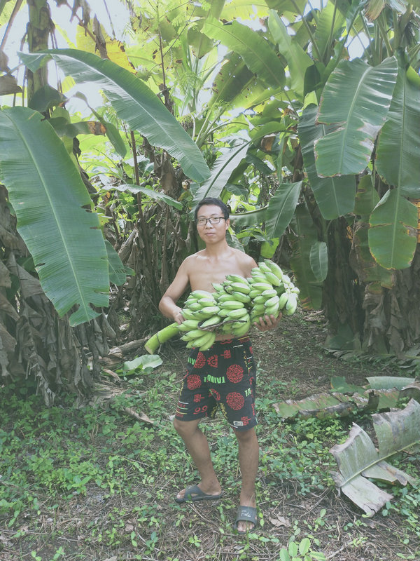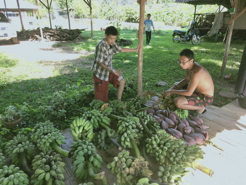 前兩年基本都是房東自己在出售園子裡的香蕉,我們只是配合管理增加種植,今年估計她沒時間再賣所以都交給了我們,第三次,我們提前一天準備整理了滿滿一車的貨物大概有30大串香蕉、幾十個香蕉花、幾十個木瓜,就在昨天光哥和輝一一同前往,輝一也想去瞭解一下市場需求量,兩位在外忙碌了一天,還是卓有成效的,一大半貨物都出售完畢,只剩最後的一些香蕉。 沒想到「萬能給力哥」對生意經也挺有想法的,初步決定每周出去一次,把家裡的水果或蔬菜多餘的集合起來一起出售,這樣既可以增加一點收入,也希望能避免一些不必要的浪費。