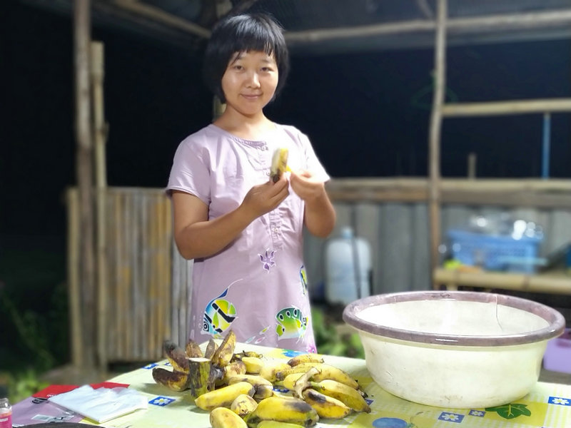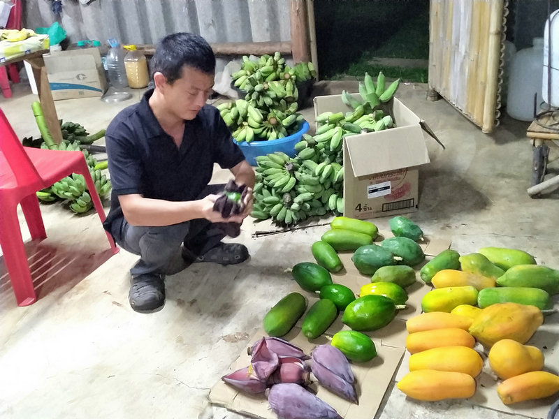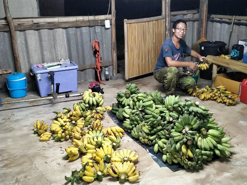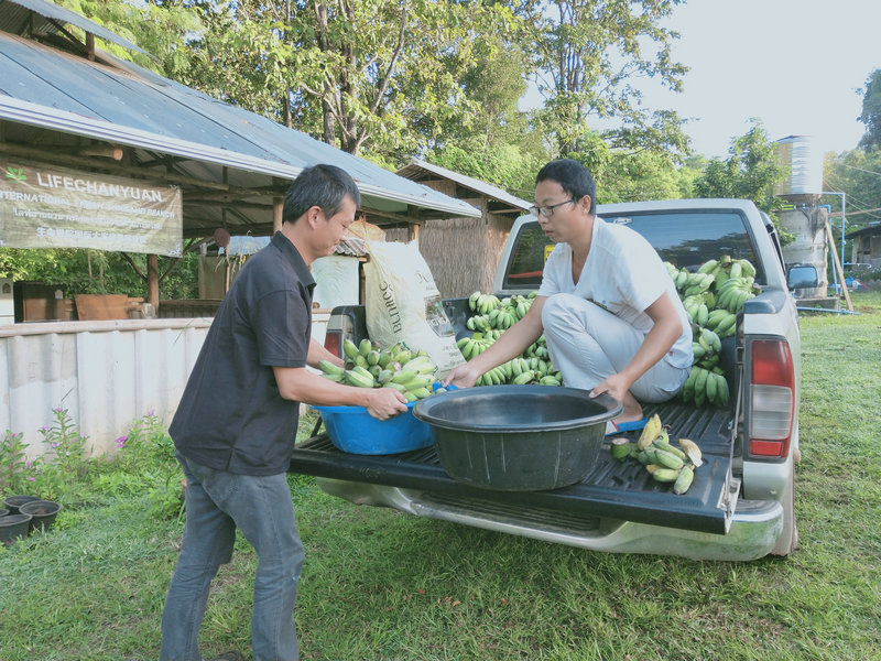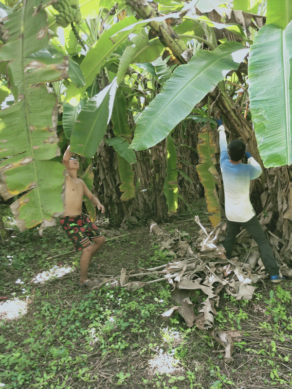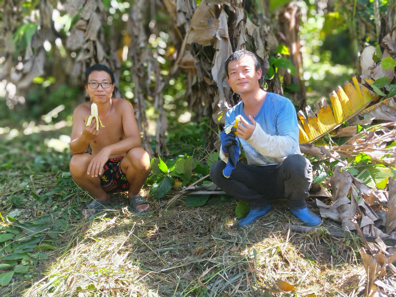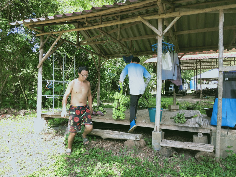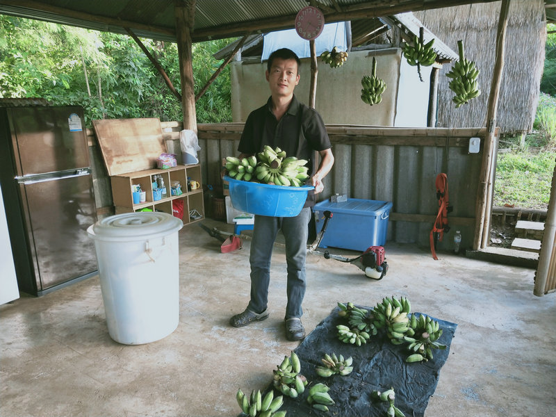 前兩年基本都是房東自己在出售園子裡的香蕉,我們只是配合管理增加種植,今年估計她沒時間再賣所以都交給了我們,第三次,我們提前一天準備整理了滿滿一車的貨物大概有30大串香蕉、幾十個香蕉花、幾十個木瓜,就在昨天光哥和輝一一同前往,輝一也想去瞭解一下市場需求量,兩位在外忙碌了一天,還是卓有成效的,一大半貨物都出售完畢,只剩最後的一些香蕉。 沒想到「萬能給力哥」對生意經也挺有想法的,初步決定每周出去一次,把家裡的水果或蔬菜多餘的集合起來一起出售,這樣既可以增加一點收入,也希望能避免一些不必要的浪費。