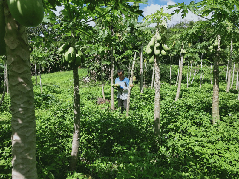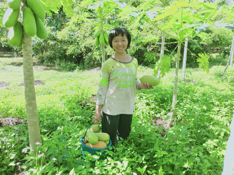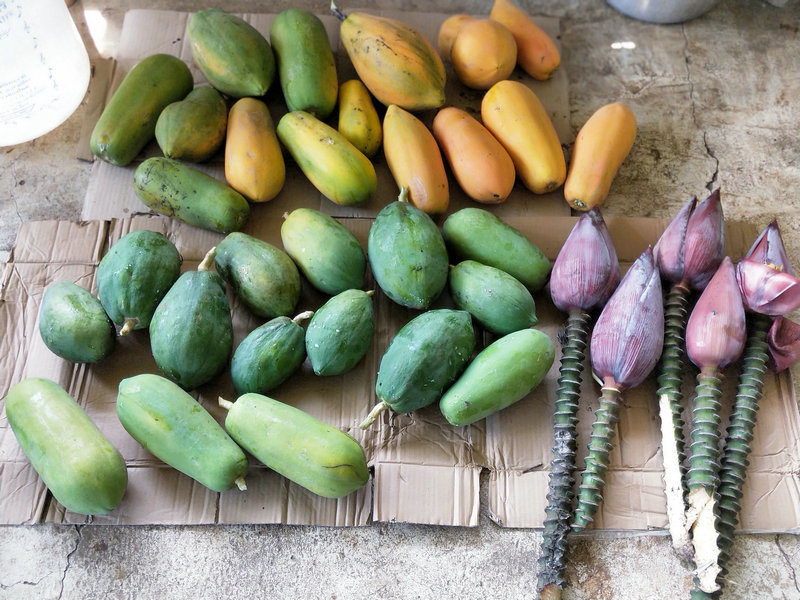話說今年的氣候有一點點反常,雨季一直下到11月份,尚且還沒有停止轉向旱季的意思,若常年風調雨順也蠻不錯的。 那天夜晚雷鳴電閃,狂風暴雨交加,下了一場罕見的大雨,結果第二早上起床后發現有6、7棵木瓜樹紛紛倒下,樹上的果子好些也跟著掉落在地上,木瓜樹由於生長速度很快,根系淺而鋪面廣,材質為空心所以比較不穩定,看著這麼多的果實一時竟不知如何處理,我們吃不完餵雞也是吃不完,於是乎,大家想起拉到市場賣賣看。
