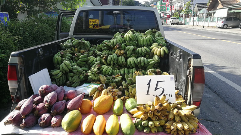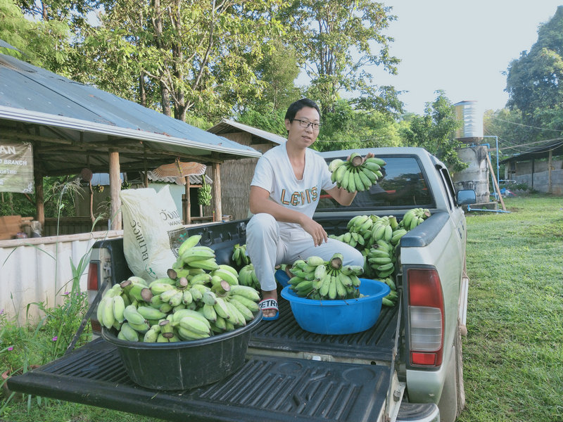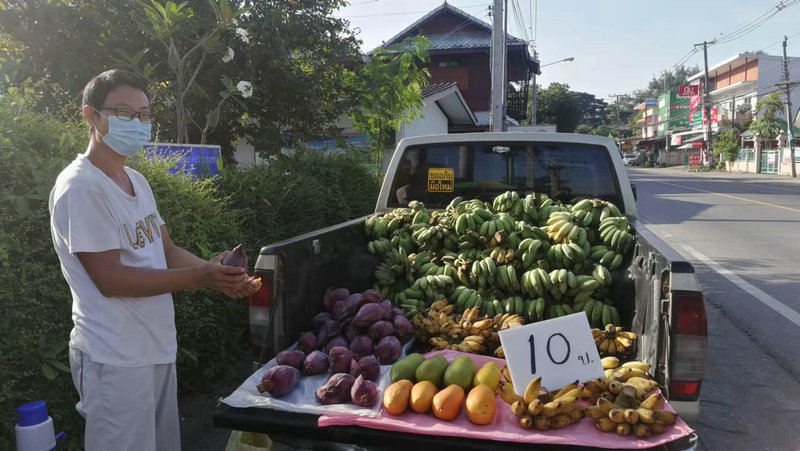 第二次,光哥一個人去繼續擺攤並多帶了一些香蕉,結果旗開得勝,只用了半天時間就一掃而光,聽說還有一個開商店的泰國姐給包場了,並且她對我們的水果、蔬菜和園子都比較有興趣,看來有望成為我們的長期客戶哦,雖然價格較低廉出售,但人家也算很捧場,賣出去至少不浪費了。