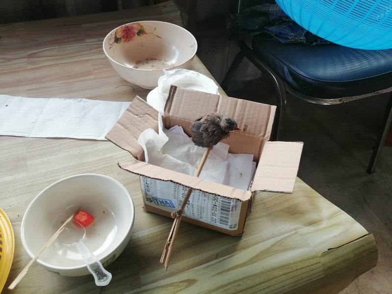 最近添了一個小新寵,輝一在幹活時從地上撿到的小小鳥,毛髮還沒長全,有一隻沒多久就掛了,他觀察了一下沒看到鳥媽媽,擔心另一隻沒吃的,於是自己把它養起來了,大概有三四天了吧,小小鳥每天歡快的鳴叫著,食慾越來越好,我估計它一天到晚能吃十多次,消化太快了,輝一給它餵各種好吃的,麵糊、蟲子、米飯、桑葚、木瓜、碎肉,白天給他及時更換“尿布”, 晚上帶到房間裡精心呵護,就像照顧一個小嬰兒,原來它還安穩的呆在窩裡,和我們熟悉了之後,這兩天開始在廚房裡自由活動了,還經常跳到人身上來撒嬌,原來喂什麼吃什麼,現在學會挑食了,不想吃的東西人家一歪頭表示拒絕,或者喂進去的東西再給你吐出來,就是這麼任性,這不學壞了嘛。