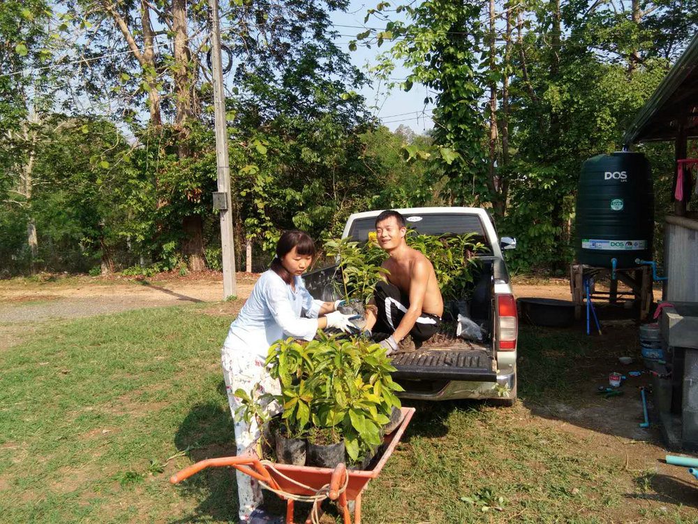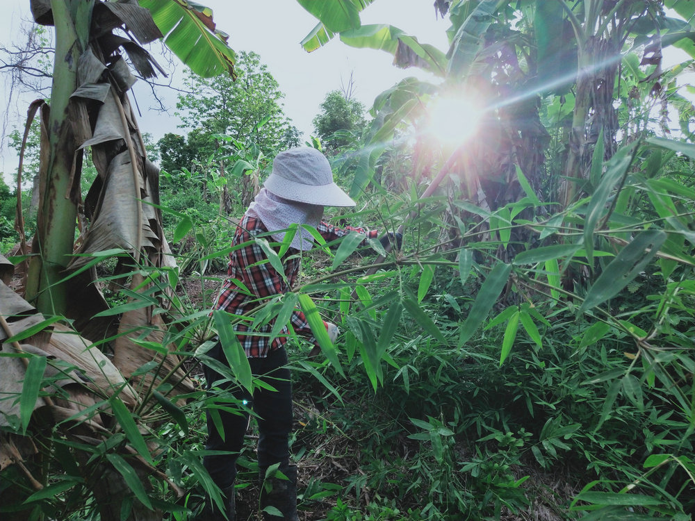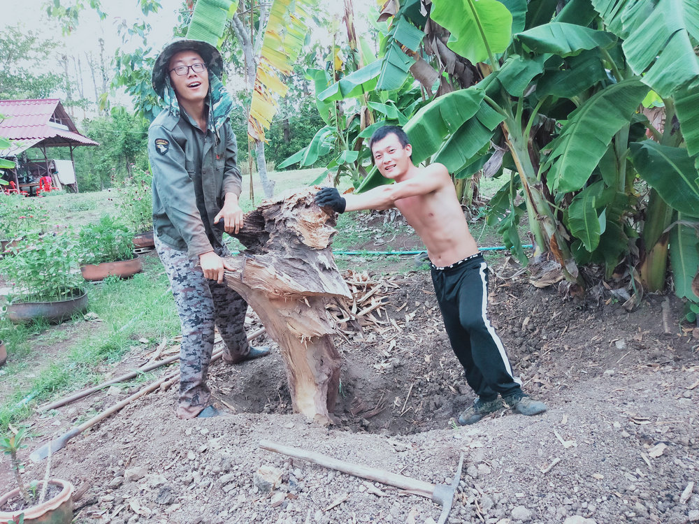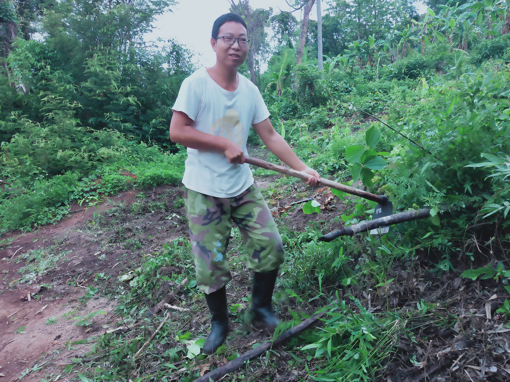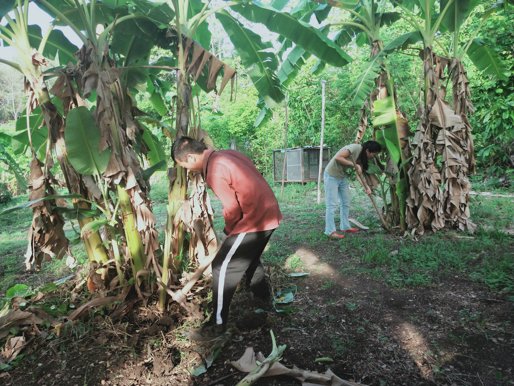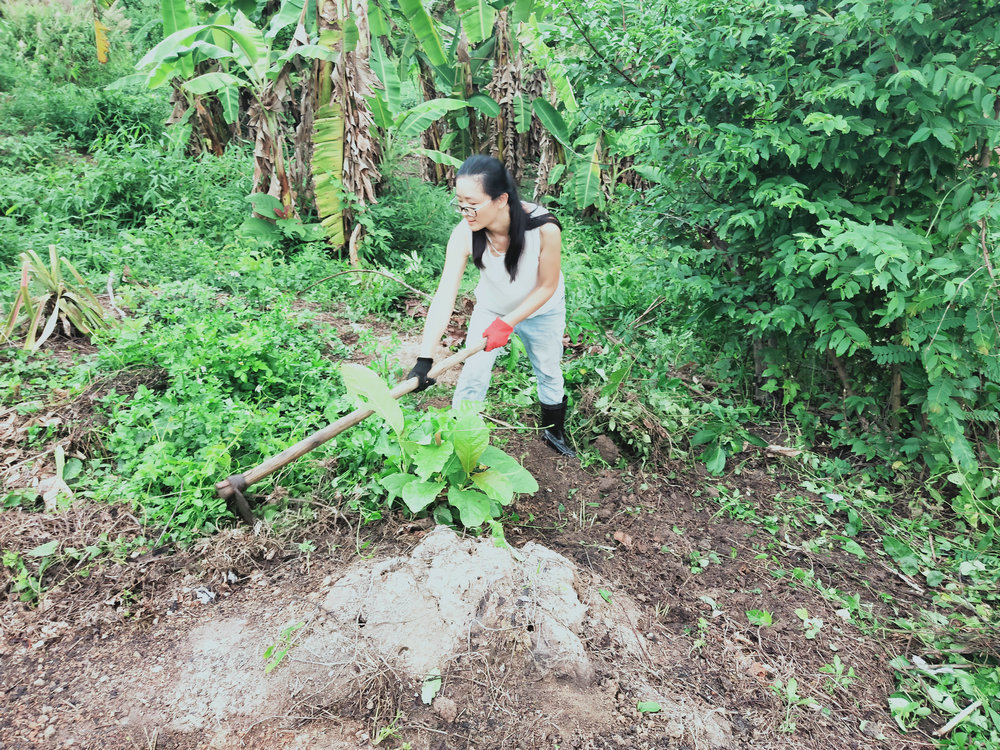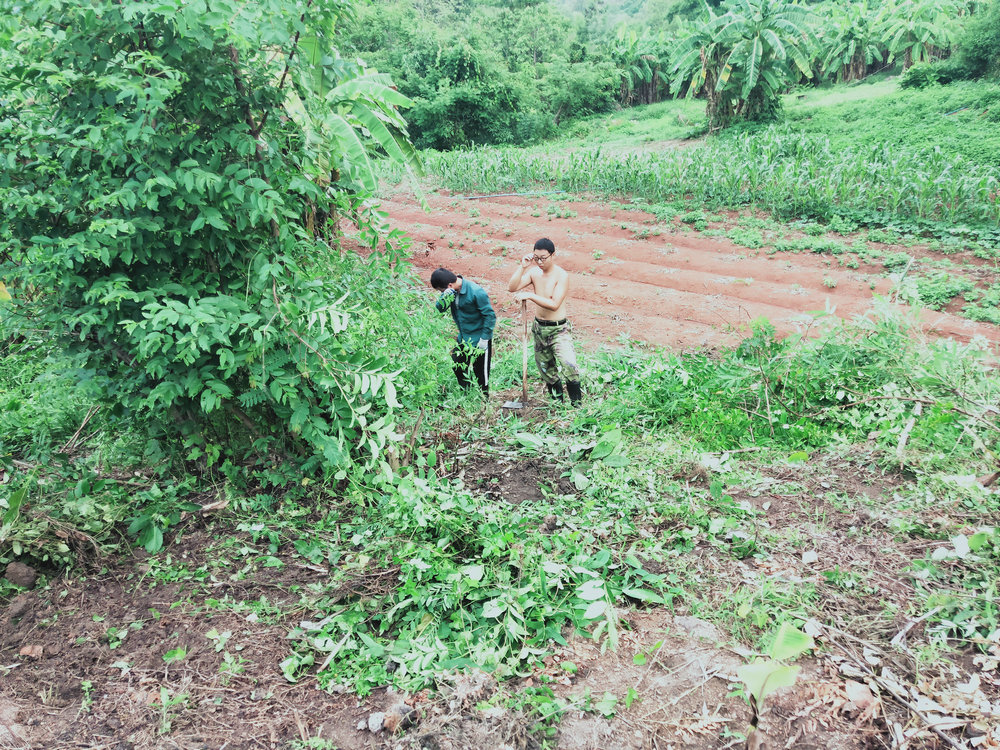 近一個多月的時間,我們5個人每天早上在山上參與集體勞動,展開了大面積的雜草清理模式,雨季真是各種植物沸騰活躍的時期哟,瞧瞧它們的生長速度就知道,這些小傢伙們被滋潤的太厲害,生機勃勃的開啟了瘋長進程,處處綠意盎然的同時,也給我們增加了困擾,這座山說起來不算大也不小,對於5個人來說工作量還是挺大的,山上各種小灌木居多, 拔根清除顯得比較難,運用割草機還是較快的一種選擇,但小草們再次生長的速度也是驚人的,不過經過了一個月與雜草做鬥爭,已經有一些很顯著的變化,在雜草出沒的地方已經逐步替換上了牛油果樹、芒果樹和芭蕉樹,除了已有的芭蕉樹、鳳梨、木瓜是現成且移植的較多外,我們又培育了幾十株鳳梨蜜樹、幾株荔枝樹、橘子樹、桑葚樹、龍眼樹等等果樹品種。