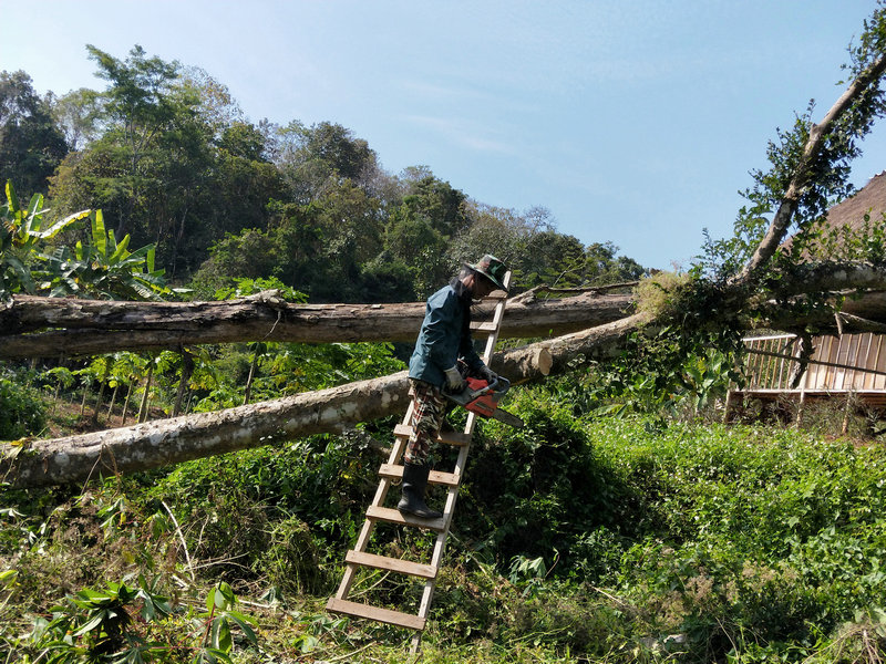 去年有兩棵大樹在一個夜裡轟然倒下,它們倒下的方向恰好有計劃的避開了輝一當時所住的房屋,其實就差一點點,這顯然是上帝在護佑了,現在旱季時期我們得閒收拾此處,順便再多備點柴火,發現了這兩棵樹有點意思,讓人想起來了那句“在天願做比翼鳥,在地願為連理枝 ”,它們相互緊緊纏繞在一起生長,可謂要活一起活,要倒一起倒,這是真正的同生共死呀, 不知是好事還是壞事?! 從導遊寫的《相擁而活難結大果》那篇天啟來看,還是各自獨立相安無事比較好,是呀,培養完整獨立意識才有機會進行更高層次生命的昇華吧。 還有,它們倒下之後並未放棄生長,依然充滿生機綠意蓬勃,真是又一次讓我見識了自然界的生命有多麼的頑強。