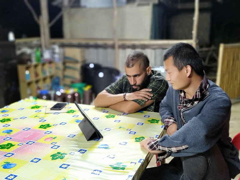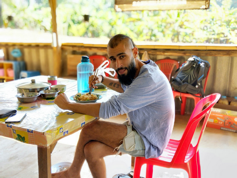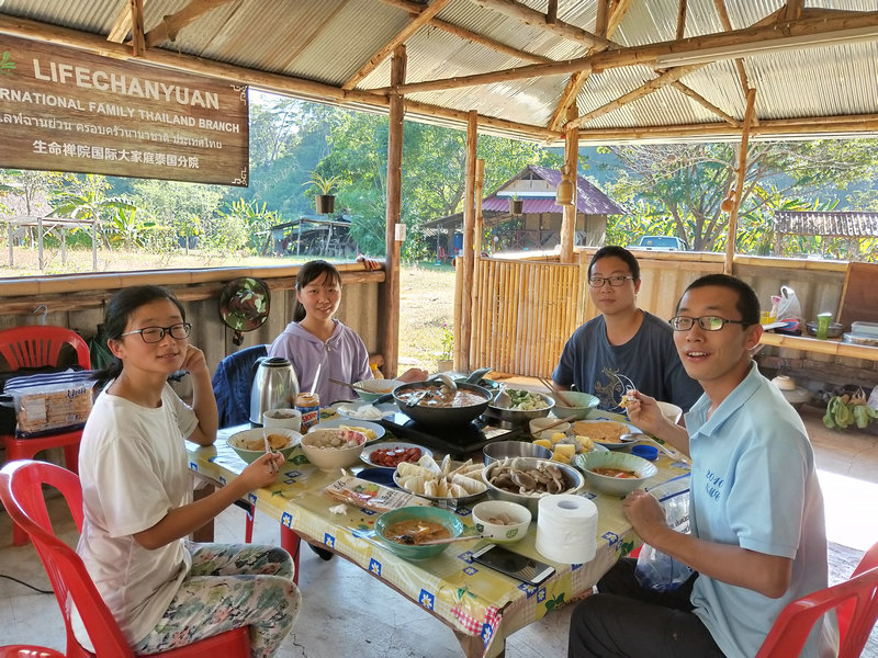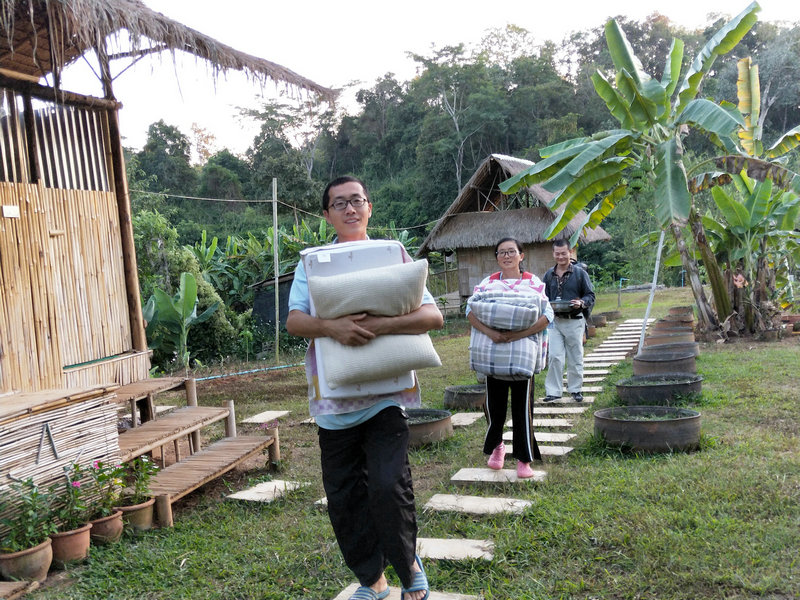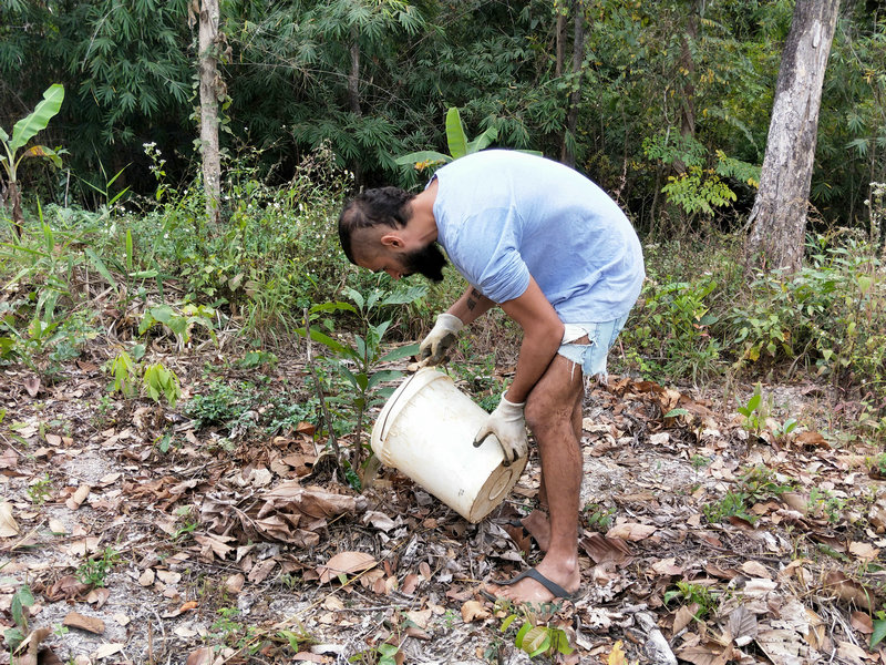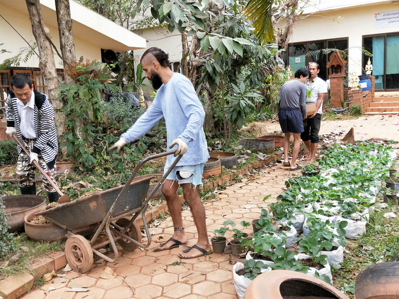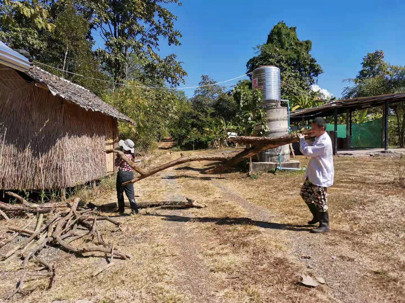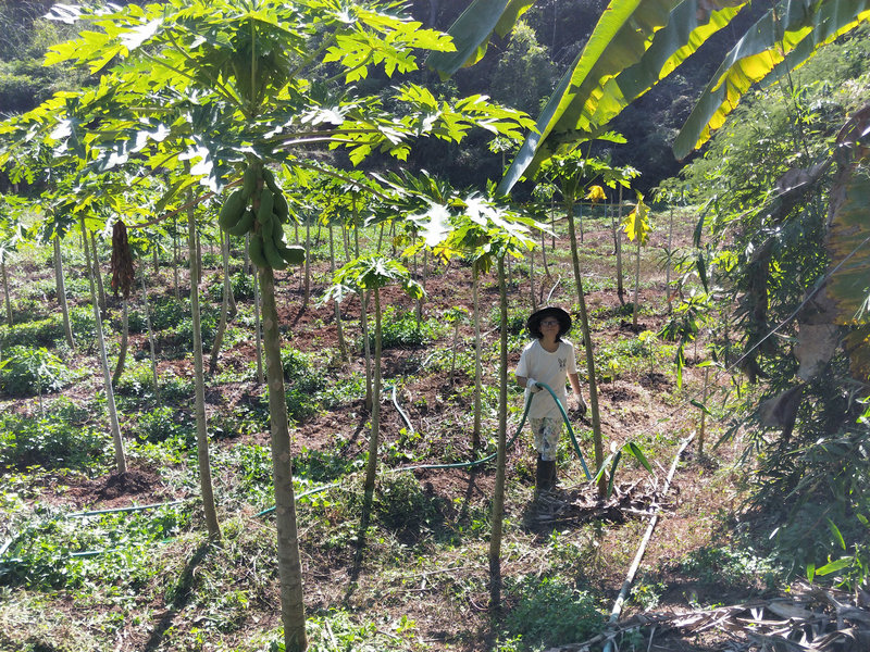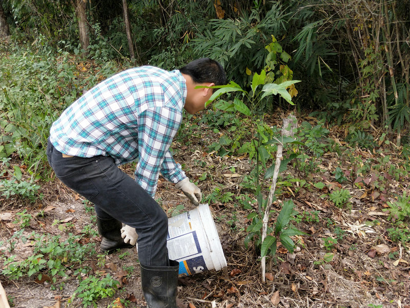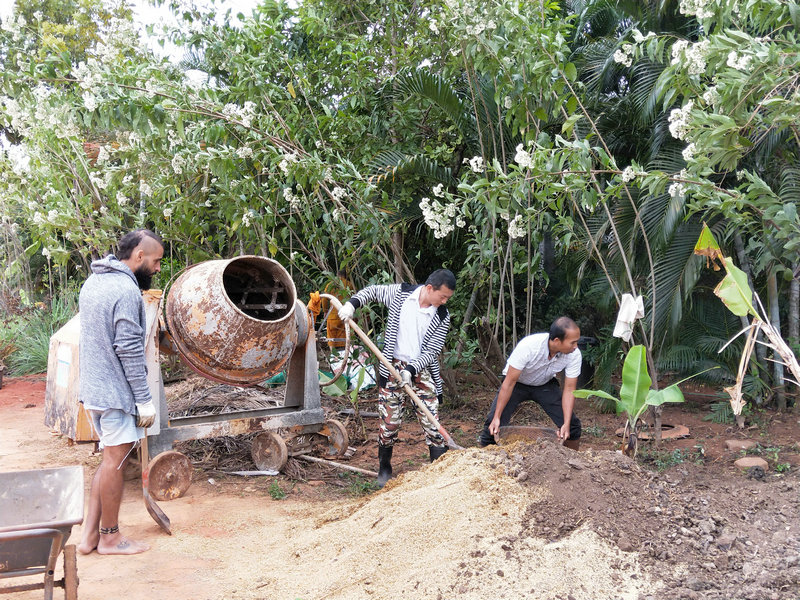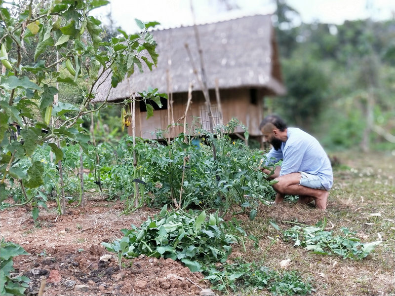 我們集體給木瓜園澆水施肥並就地除草做了覆蓋,輝一和新來的小哥哥又挑水給去年種下的芒果樹牛油果樹澆了水做了覆蓋,山上的香蕉樹成活率很高,比較皮實且生長速度快,現在已然山上山下遍植,看來這裡是香蕉樹的天下嘛。 光哥應邀請前去泰國二分院幫忙,再說說這位以色列小夥,他是Daivd的朋友,一位素食主義者,年齡和我們相仿,聽說他能做很多事情。 果然一來就到菜地幫我們修剪了所有的西紅柿菜苗,好像對菜地管理很有興趣的樣子,勤勞能幹還幫忙澆水,整理香蕉樹,一起去隔壁寺廟給龍袍幫忙。 輝一給他介紹了一下我們家園過去的歷史 書籍包括視頻,他覺得很不錯,希望他對人類新生活模式有更深入的體會和認識。