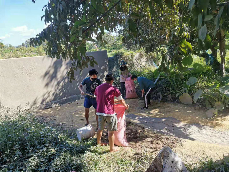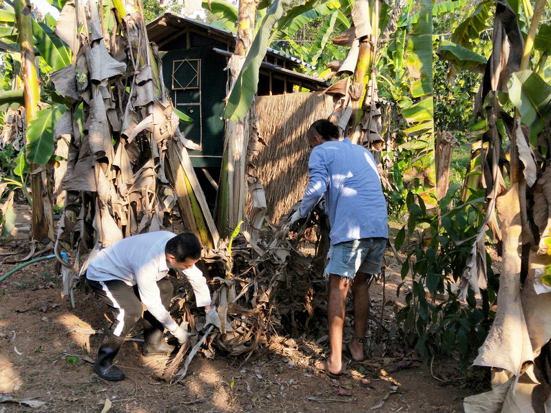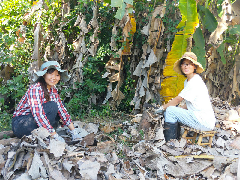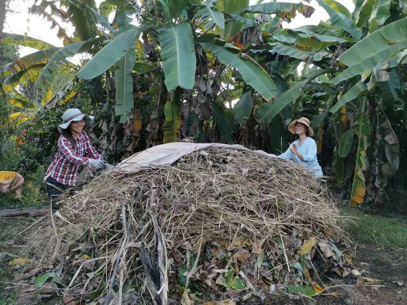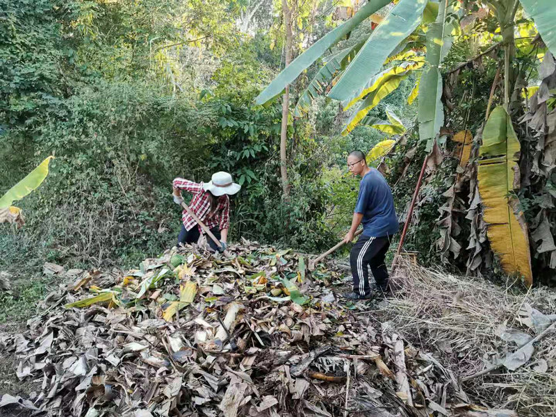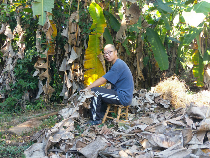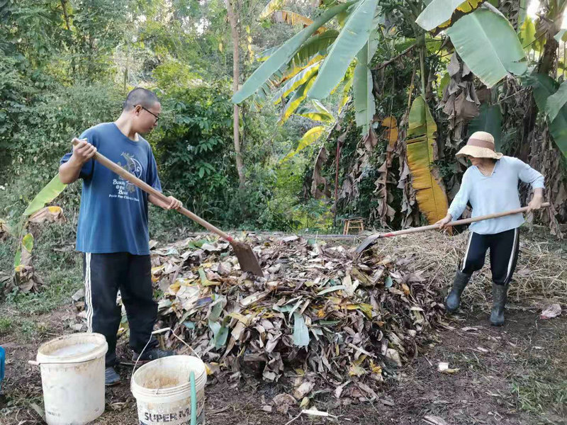 前段時間和千姿光哥一起用香蕉桿製作了有機堆肥,利用香蕉園裡光哥平日修建下來的枯枝敗葉和一些不再結果的樹杆,一一砍斷后,又混合了輝一割過的乾草堆,再加上適當的水及自製尿素酵素,堆肥就完成了,估計等一兩個月就漚制的差不多了。