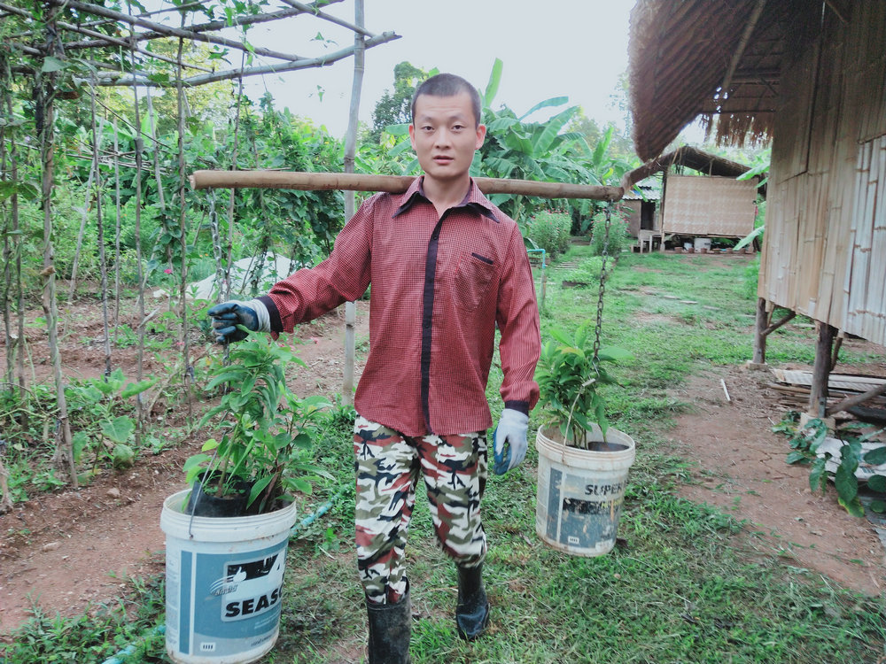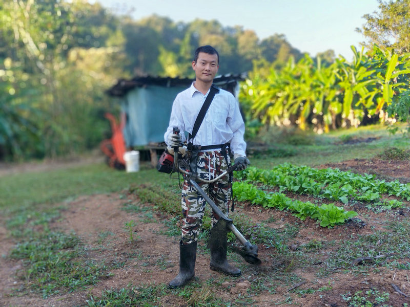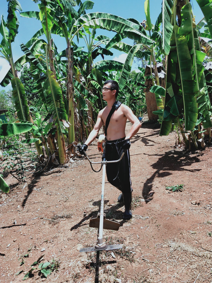 生命禪院的輝一草一個人勇闖天涯,開拓新疆域,在異國他鄉撐起一片天空,司機、採購物品、辦理簽證、接待來賓處理外務、割草、劈柴、堆肥、整理院落、果樹管理、建築配合等等,將自己的才能和激情獻給了這片熱土,最欣賞最令我感動的是他大部分時間是在割草維護著一分院的山上山下,讓這裡從一片雜草叢生荒蕪的狀態到現在的井然有序清爽宜人,他就像一位戰士,抗著割草機隨時準備“衝鋒陷陣”,在泰國烈日炎炎的太陽底下,每次都是汗流浹背的回來,耐力毅力很是超凡。
