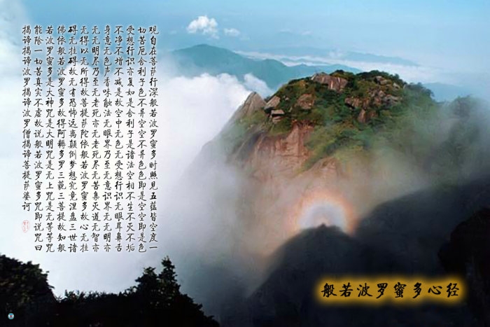 觀自在菩薩. 行深般若波羅蜜多時. 照見五蘊皆空. 度一切苦厄. 舍利子. 色不異空. 空不異色. 色即是空. 空即是色. 受想行識. 亦復如是. 舍利子. 是諸法空相. 不生不滅. 不垢不淨. 不增不減. 是故空中無色. 無受想行識. 無眼耳鼻舌身意. 無色聲香味觸法. 無眼界. 乃至無意識界. 無無明. 亦無無明盡. 乃至無老死. 亦無老死盡. 無苦集滅道. 無智亦無得. 以無所得故. 菩提薩埵. 依般若波羅蜜多故. 心無掛礙. 無掛礙故. 無有恐怖. 遠離顛倒夢想. 究竟涅盤. 三世諸佛. 依般若波羅蜜多故. 得阿耨多羅三藐三菩提. 故知般若波羅蜜多. 是大神咒. 是大明咒. 是無上咒. 是無等等咒. 能除一切苦,真實不虛. 故說般若波羅蜜多咒. 即說咒曰. 揭諦揭諦. 波羅揭諦. 波羅僧揭諦. 菩提薩婆訶.